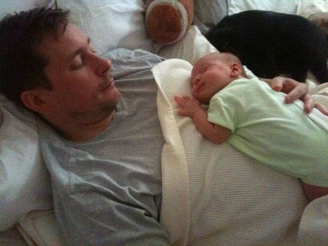Here I am asleep on my dad. He’s pretty cool. He’s been taking care of me all morning because mom is tired and not feeling well. I can’t wait until I can make him things from styrofoam cups or draw turkeys by tracing my hand.