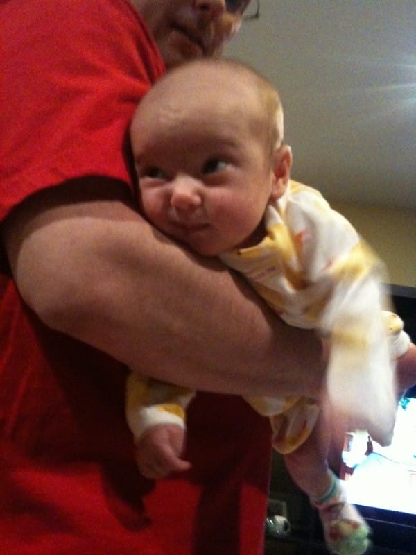 Dad learned a new way to carry and burp me….I’m not the biggest fan. But it does seem to help my gas bubbles. But really, how embarrassing.