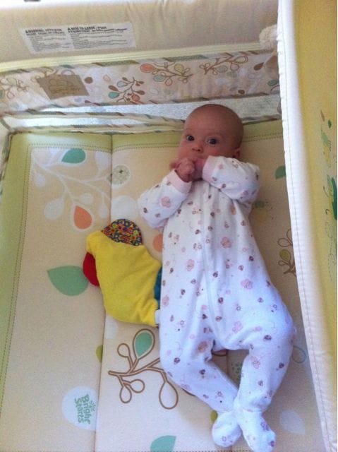 I’ve been letting mom sleep in, since she hasn’t been feeling well. I hung out in my pack n play while she ate breakfast, and now she says we can go up & get dressed to start our day.