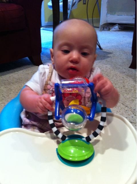 I’m in my bumbo seat with my new toy. Ha ha grandmom and poppy, I got my own.