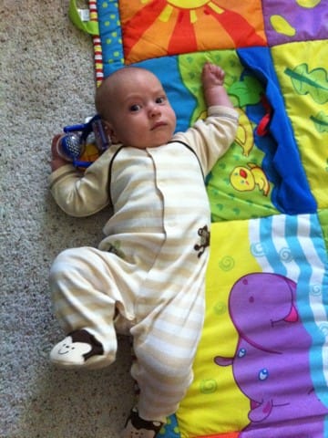 Mommy bought me new monkey pajamas because she and daddy liked the ones I had when I was little. This picture was taken right after I rolled from my tummy to my back. Mom & dad are proud of me.