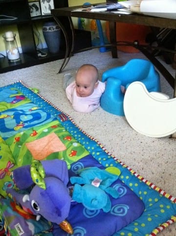 I can’t crawl just yet, but I figured out I can roll around to go places. I rolled off my mat to get to my bumbo seat.