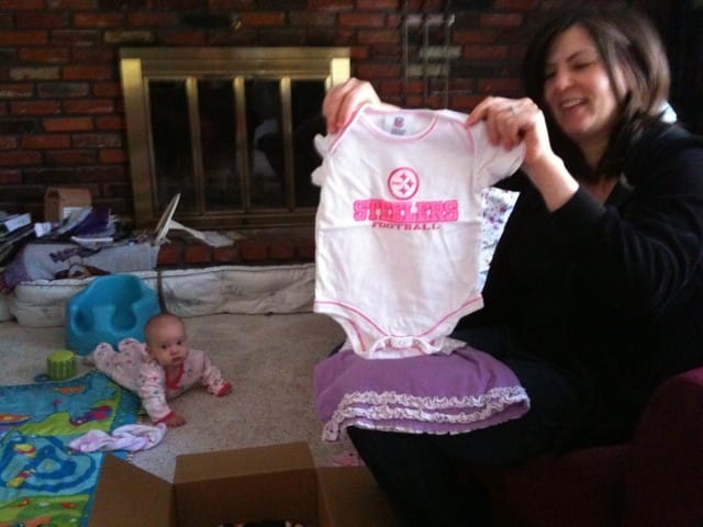 Grammy sent another gift box filled with goodies. She likes me. Mommy got extra excited about the clothes in the bottom…Grammy sent Steelers stuff. Sad that mom and Grammy are in denial. I’m a Dallas Cowboy fan like my daddy.
