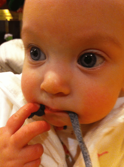 I’m sitting here on mommy’s lap, and the string from her sweatshirt hood is right here for the chewing. Tasty.