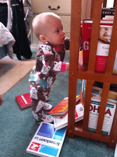 My reading choices are varied… At bedtime and naptimes, I enjoy Sandra Boynton, Dr. Seuss, and such classics as “Pat the Bunny.”