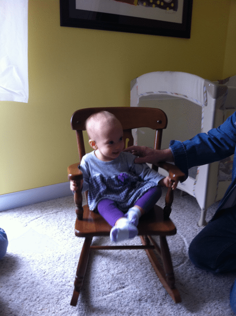 …in my new rocking chair that Grandmom & Poppy gave me as a Baptism present. It’s an antique… My grandmom had it when she was a little girl, and they had it restored for me.