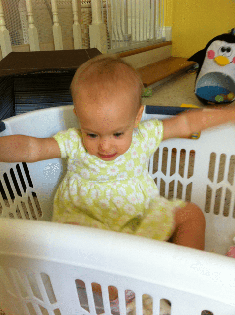 … And I’m playing in the laundry basket. Mommy’s just shaking her head.