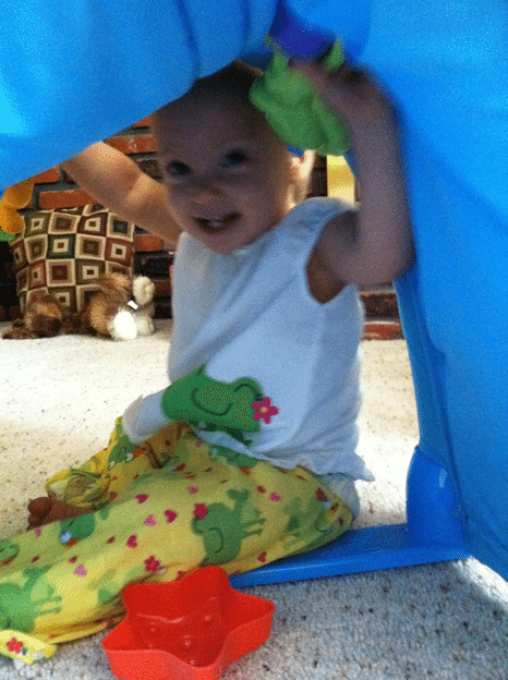 Mommy pretends she can crawl through the tunnel, but she’s too big. That’s ok… I crawl through to get to her.