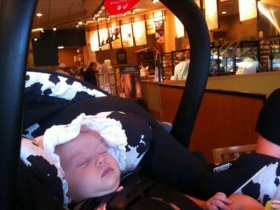 Out running errands. We stopped for snacks and coffee (for dad). But I just dropped my new rattle. And dad is not noticing. Always with the photos.