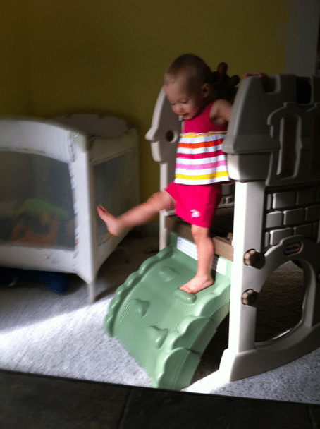 Mommy thinks I’m determined to fall on my head. I was dancing around on my castle slide, but I have everything under control.