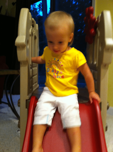 I like having this slide in the house. Mommy won’t take me outside because it’s getting late, so it’s nice that I can still play.