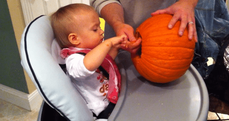 I’m helping daddy scoop the guts out of my pumpkin. Fun and messy!