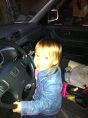 I climbed in here, even though it says you have to be three years old. Mommy let me play in the car for a while because she loves me.