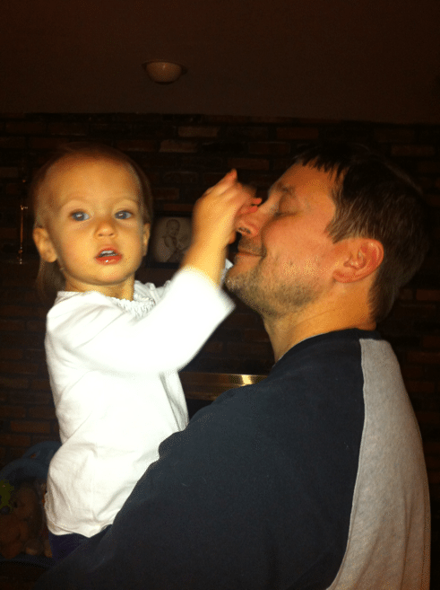 He lets me play with his scruffy whiskers, and he taught me that I can make his nose go “honk.”