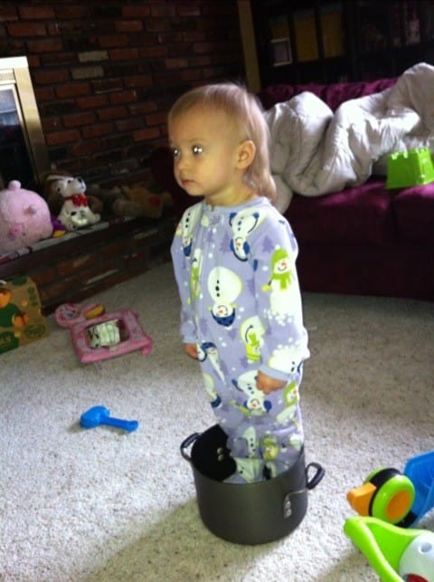 While mommy emptied the dishwasher, I pulled ALL the pots & pans out of the cabinets. Then I brought this pot in to the family room – apparently because I needed a place to sit. It’s not very comfortable, though. Mommy will need to buy some bigger pots.