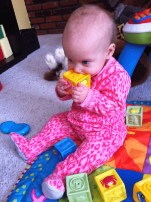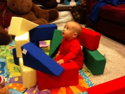 Here I am, sitting among a pile of blocks. Maybe someday I will build something. But, for now, I’m content to let mommy build stuff – and then I knock it down.