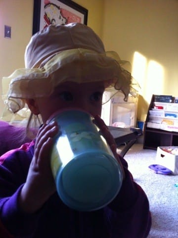 I won’t get in my high chair to eat lunch, so for right now, I’m just drinking milk. And I’m getting it all over my face.