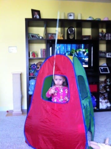 Tent funI piled all my stuffed toys in my tent. Now I'm sitting in it pulling…
