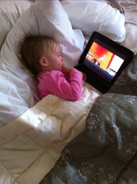 I woke up cranky. Now I’m in mommy & daddy’s bed, watching Monsters, Inc on the iPad.