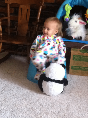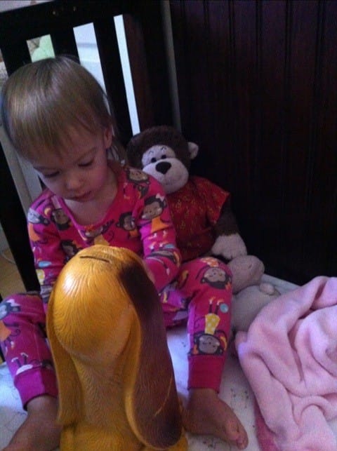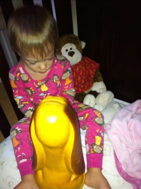 I was awake at 4am again – got sick again. The one good thing about getting sick is that mommy & daddy give me (almost) anything I want. I spied mommy’s doggie bank this morning, so she’s letting me play with it in my crib.