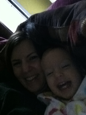 Mommy & I are both sleepy, and I’ve been cranky. Mommy’s enjoying some quiet time while I snuggle up on her.