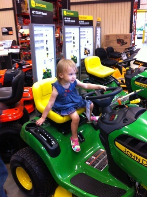 Only a proper lady can ride a “tractor” wearing a dress and sandals.