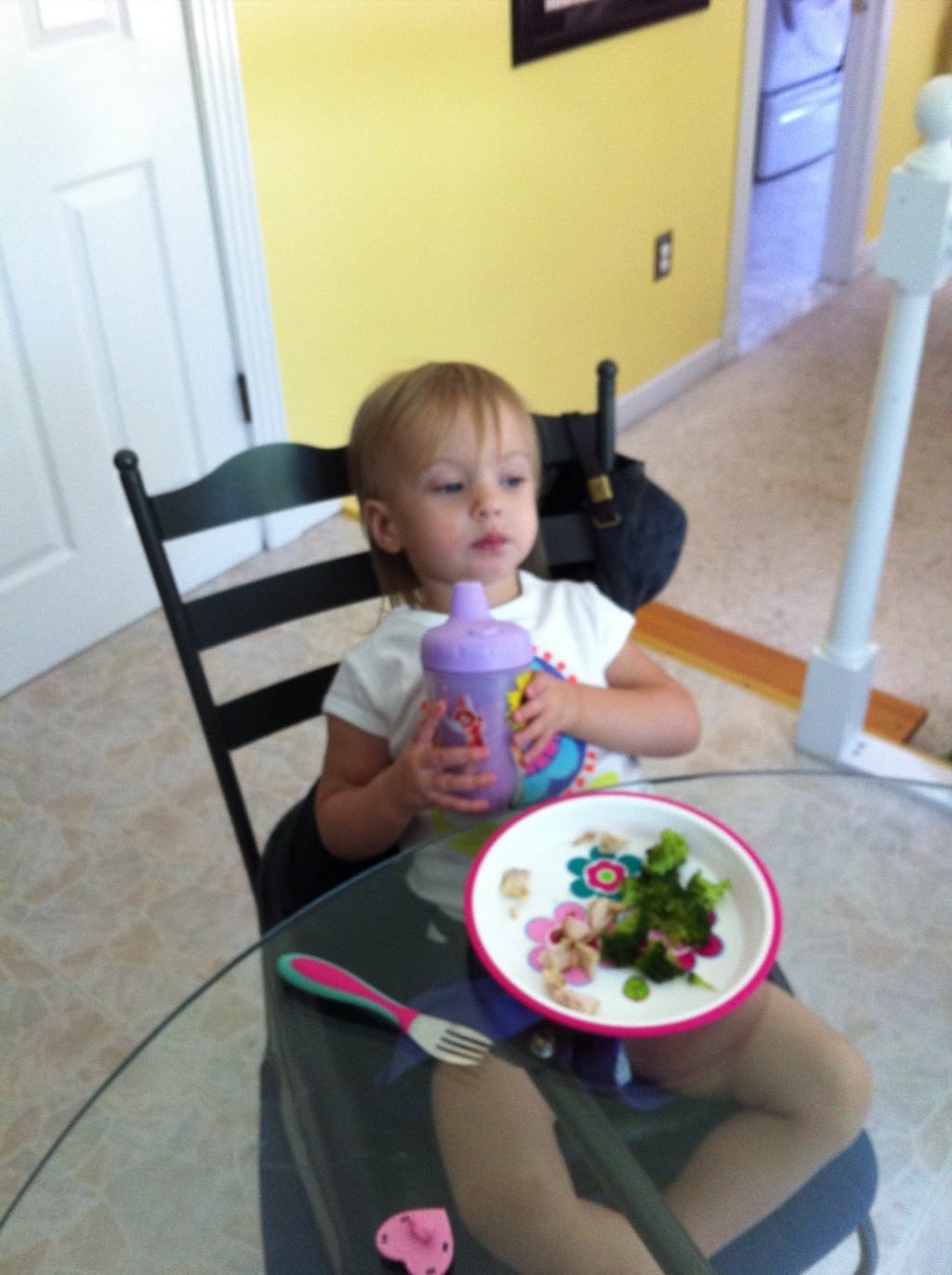 Mommy was eating turkey and broccoli for lunch, and I kept picking off her plate. So, being the good mommy she is, she made me my own plate of turkey & broccoli. She’s even letting me eat without a bib. If it weren’t for the sippy cup, I swear I’d be mistaken for a grown-up.