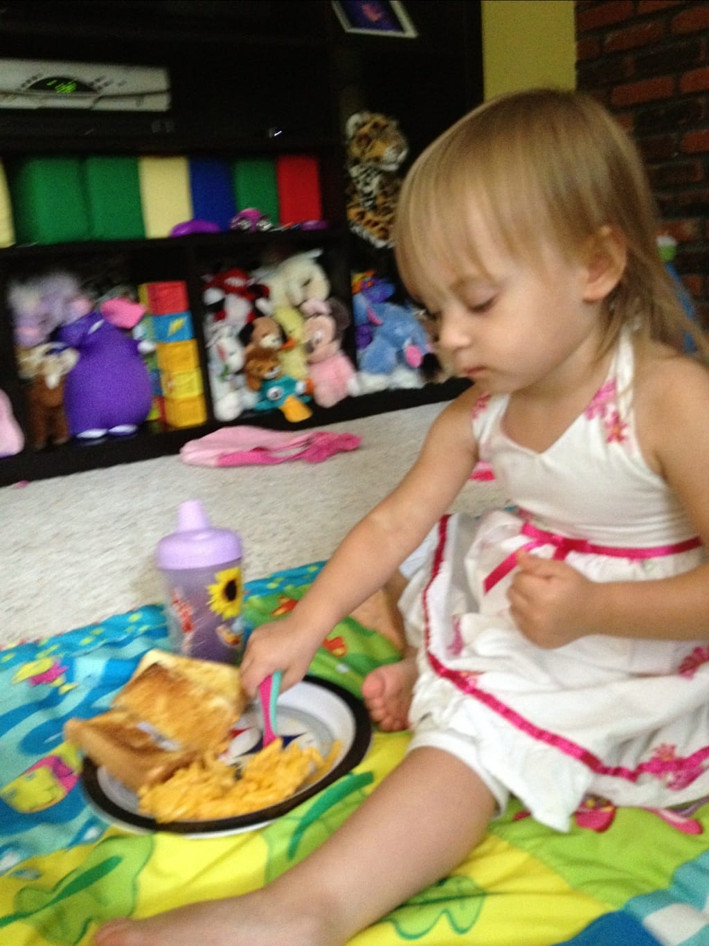 Dad came home from work to let mommy take a nap. So dad made me dinner. Ronis and toast. And he’s letting me eat in the family room while I watch up. He spoils me.