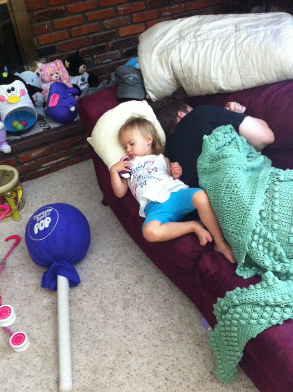 Daddy has been working really hard, and has been tired, so he fell asleep on the sofa. I went out to the living room and got a pillow, then I tried to snuggle in next to him. He didn’t leave me much room…
