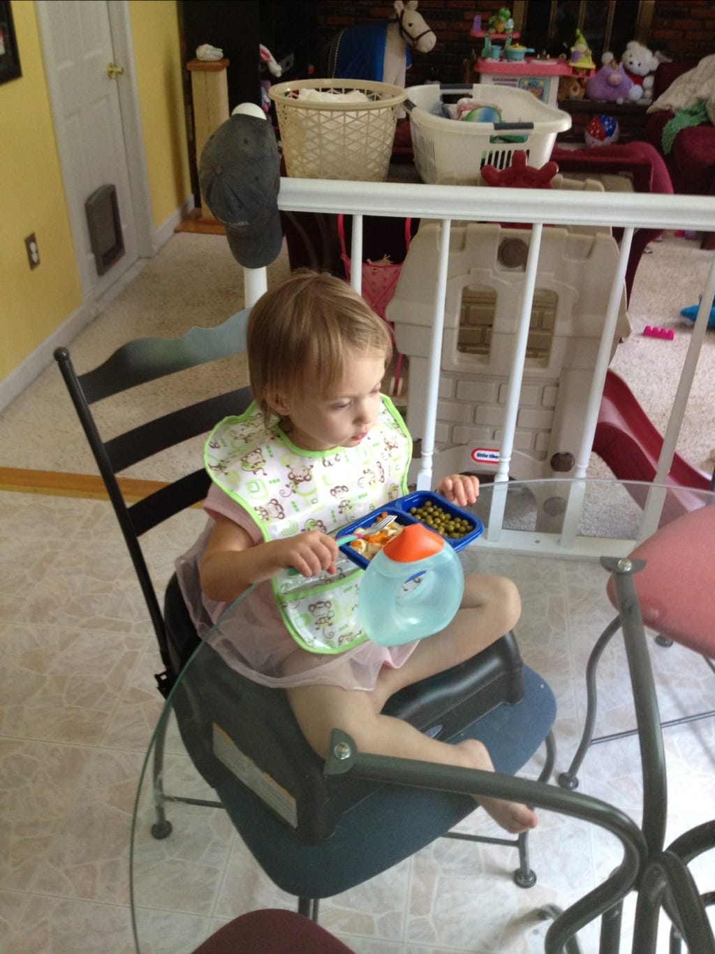 After visiting grandmom & poppy I’m tired. So when we got home I changed into my nightgown and I’m eating lunch. Then I think a nap will be great.