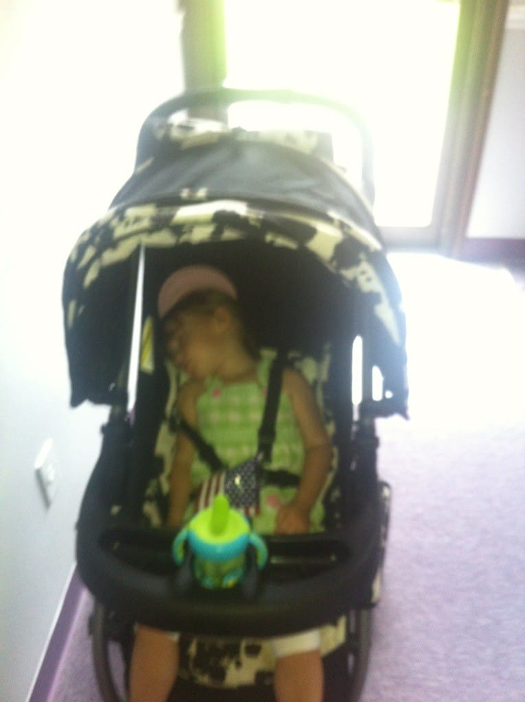 Daddy’s sick, and I haven’t been getting enough sleep. Mommy’s frazzled, but she got an idea. She put me in my stroller & we walked up to the office to take care of Miss B. I fell asleep shortly after we left the house. Mommy gets exercise and a break from my crankiness – smart mommy!