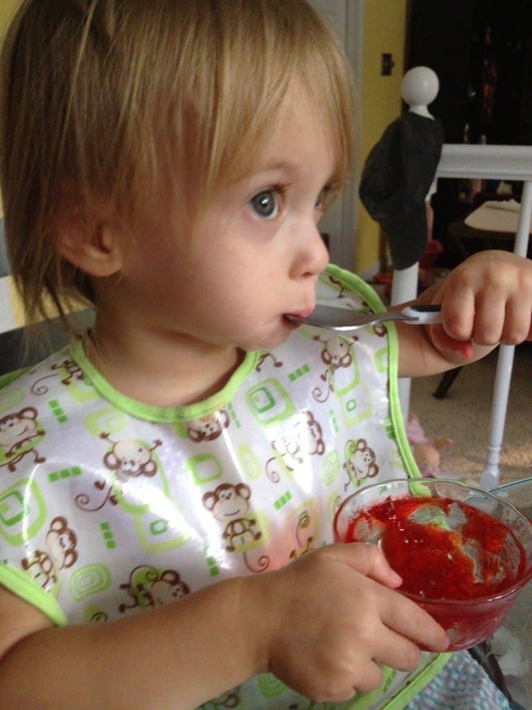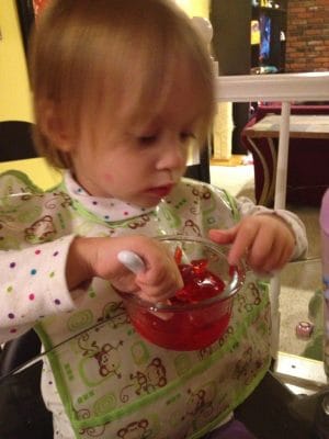 Daddy and I shared cookies and milk. I drank from my big girl Madeline cup. Then I had red jello. Yummy.