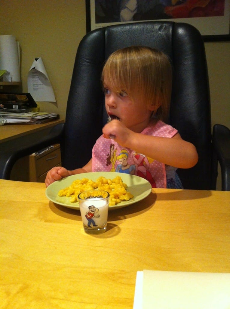 Eating mac & cheese (ronies) and watching Pocahontas. Please try to ignore that daddy served my milk in a highly inappropriate Quagmire shot glass.