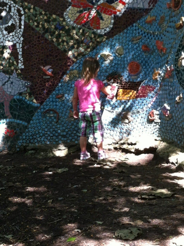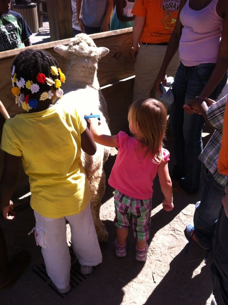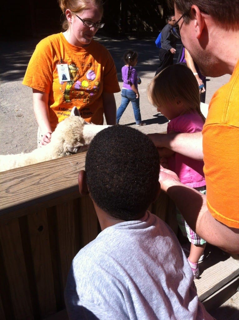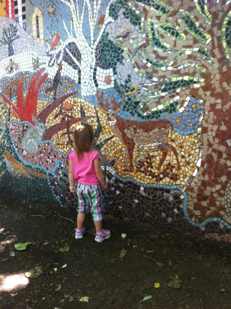 There was a special area in the zoo for little kids like me. I enjoyed the mosaic mural, and I liked looking at & petting & feeding all the animals. We even got ice cream!