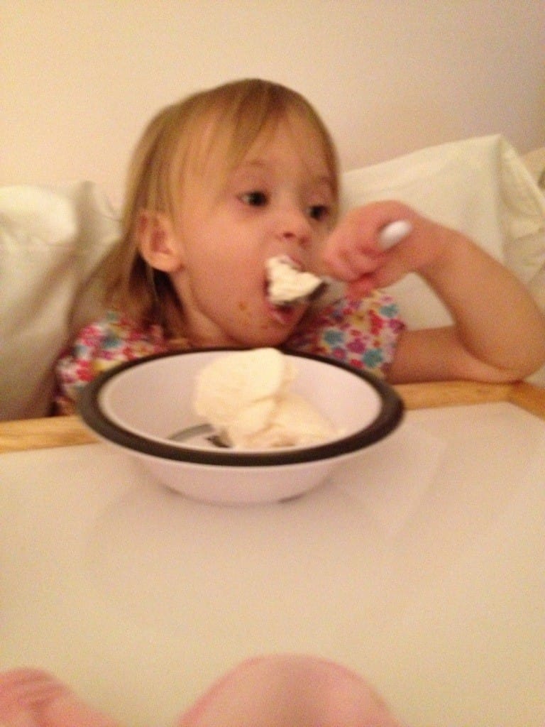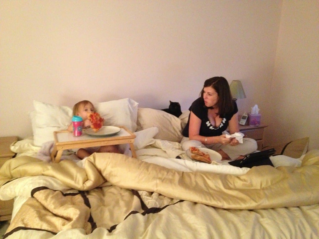 Mommy is sick. So daddy and I brought her pizza in bed. Then I wanted to eat with her. So dad hooked me up.