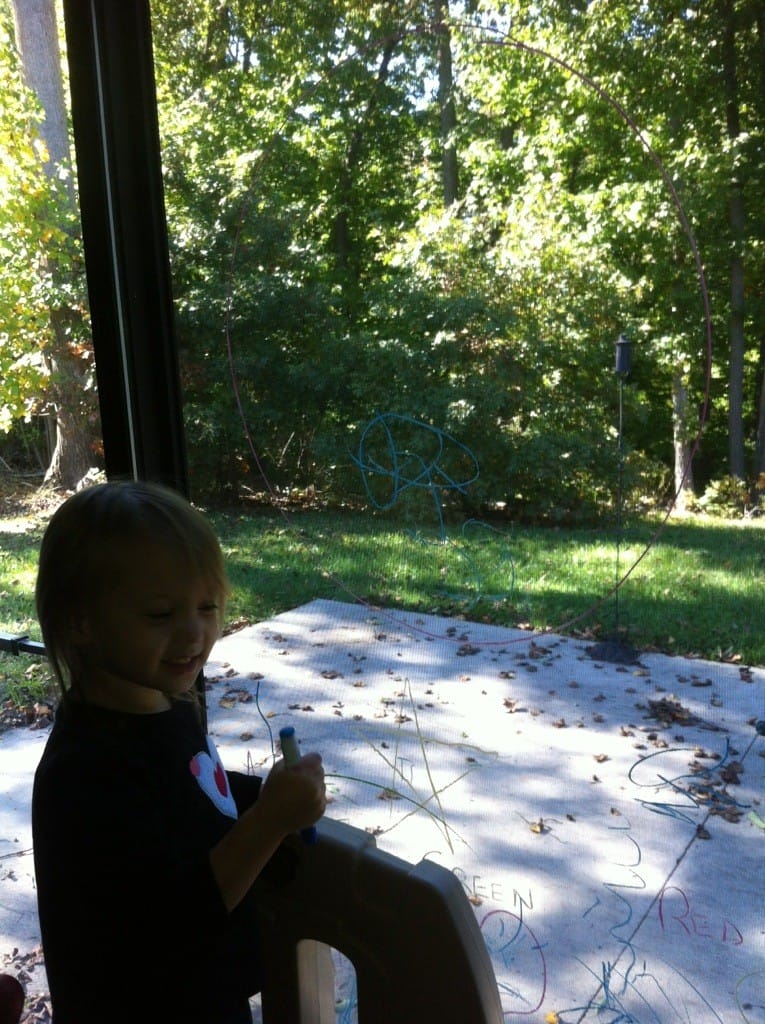 I drew on the bottom of the doors with my window crayons, but I couldn’t reach the top. Mommy helped me out: she moved my slide over here so I could reach up high!