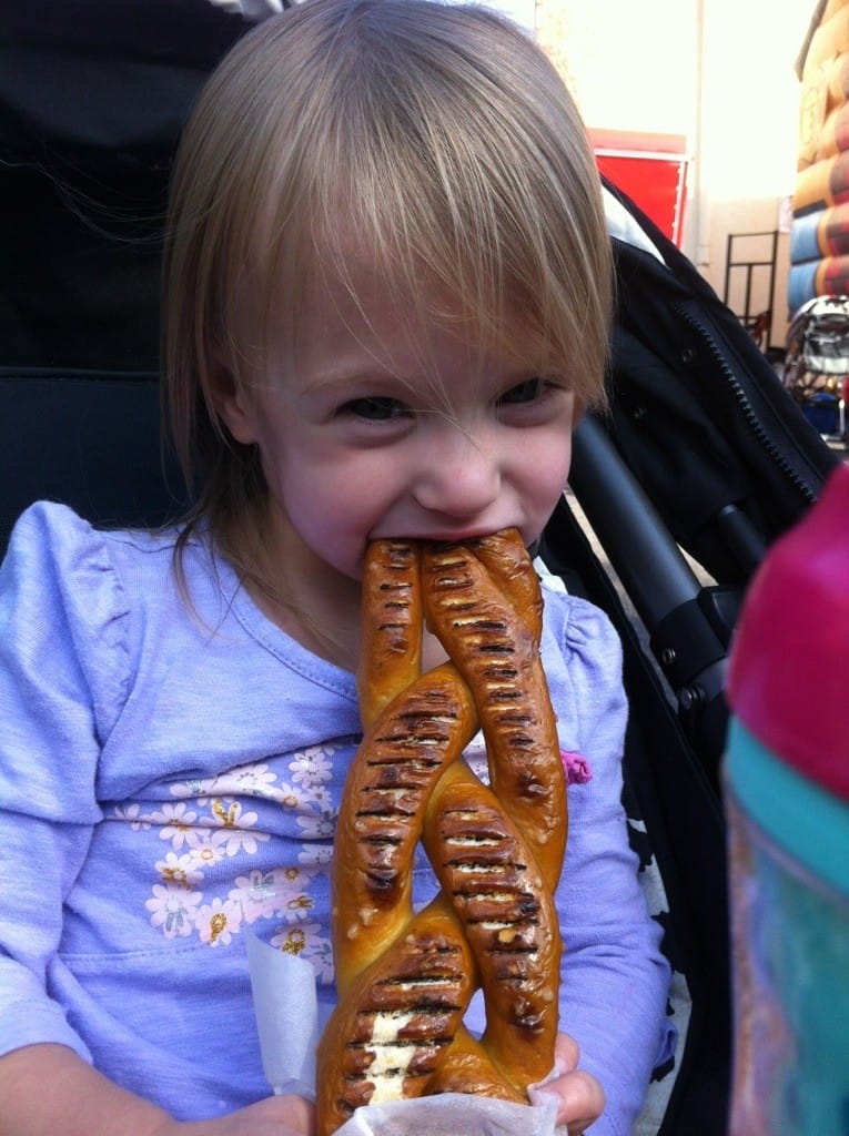 The first place we stopped was out of pretzels, but we finally found one. I snacked while waiting for daddy.