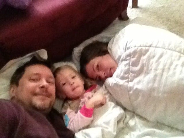 Mommy isn’t feeling well. So dad and I were letting her sleep. But she came downstairs and snuggled with daddy and me. We’re laying on the floor in a bed I made.