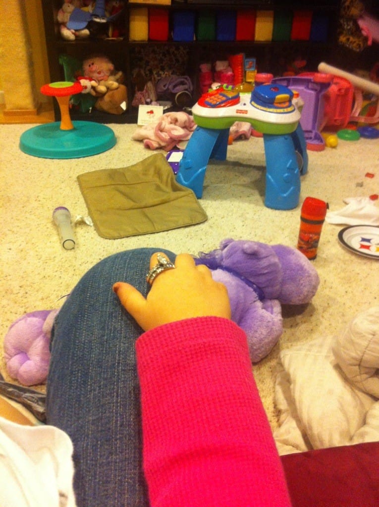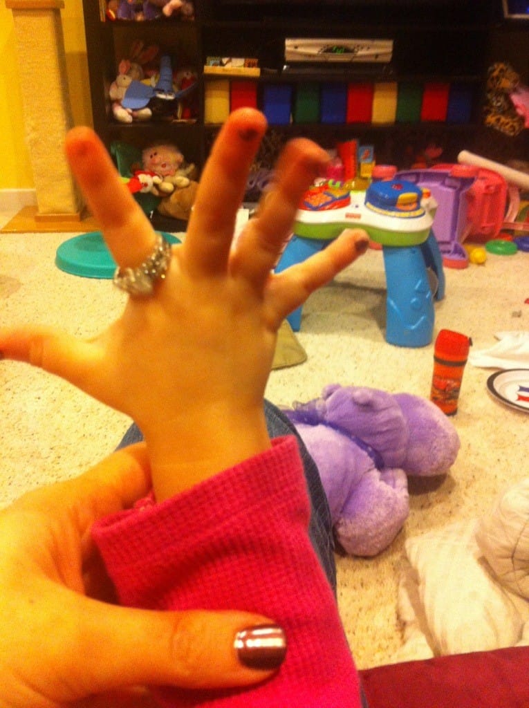I asked mommy if I could wear her ring & she let me. I have it on the wrong finger, but I still think it looks beautiful.