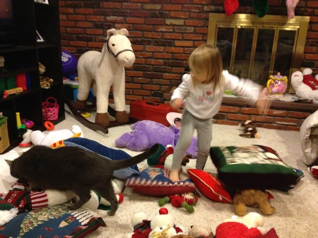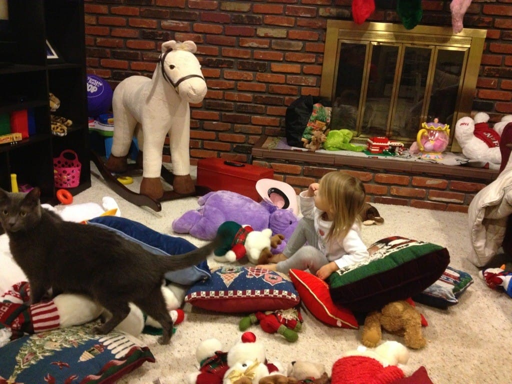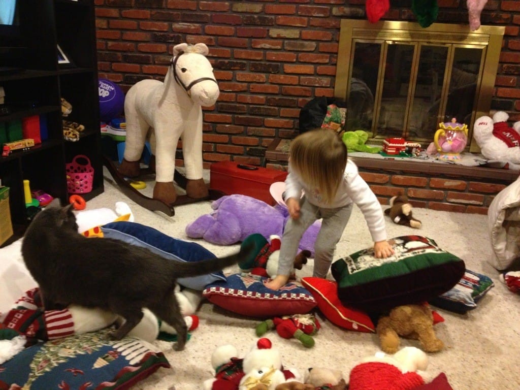 Grandmom & Poppy sent over Xmas pillows. Dad just brought them in. Now I’m playing in a pile of pillows.