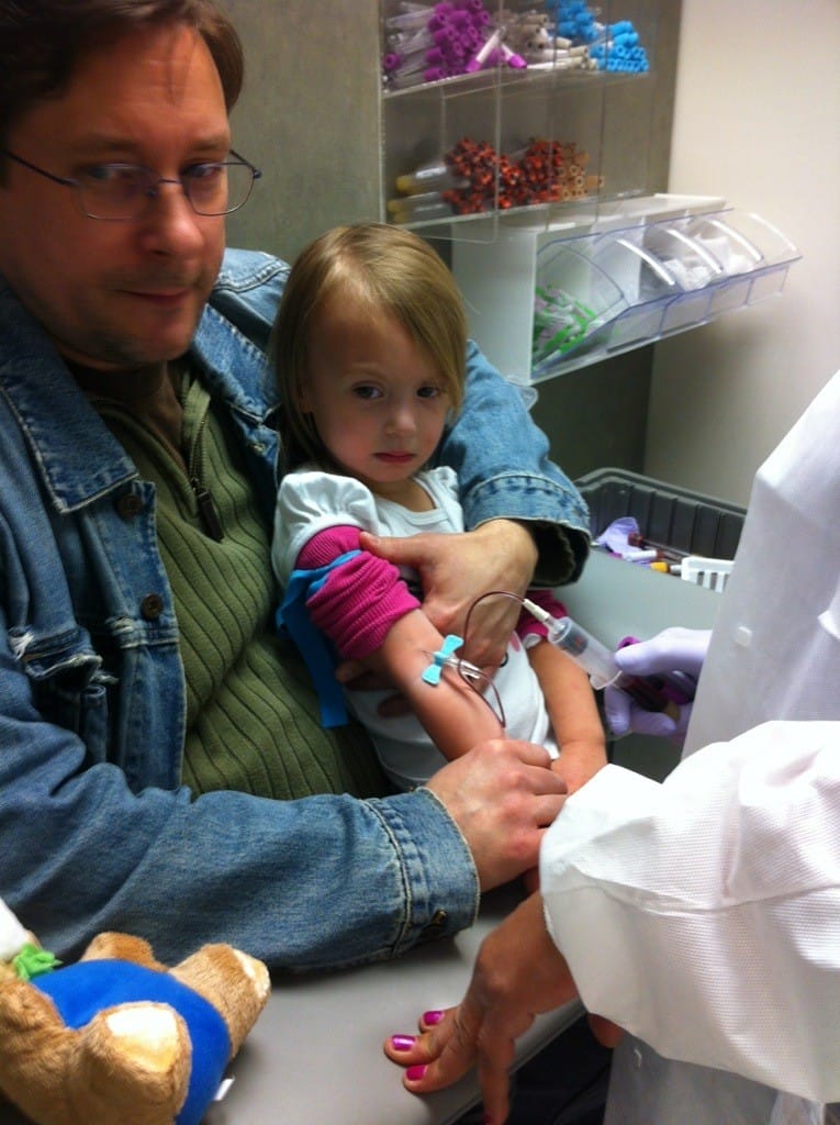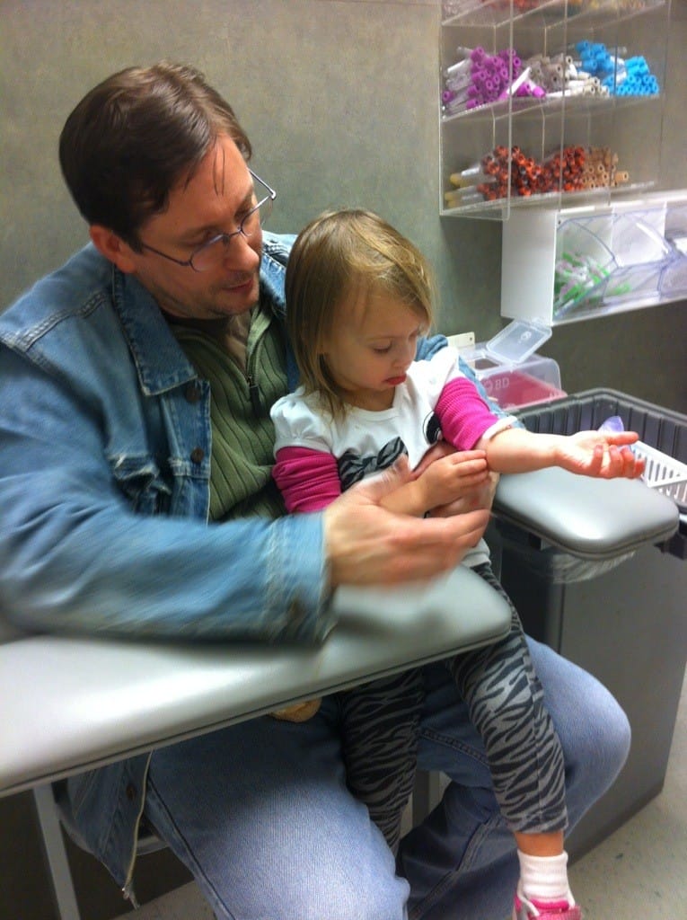 So, they had to call in a “ringer.” She poked my other arm, and was able to get all 4 vials. I did cry a little bit, but not too much. Mommy and daddy both said I was very brave.