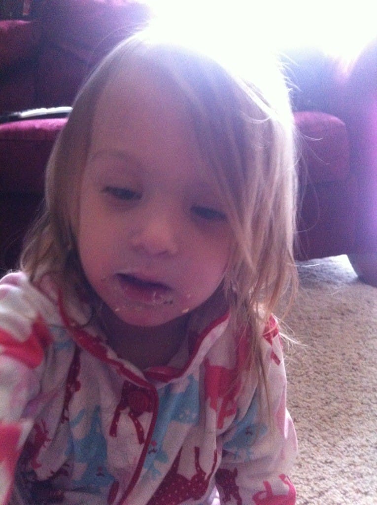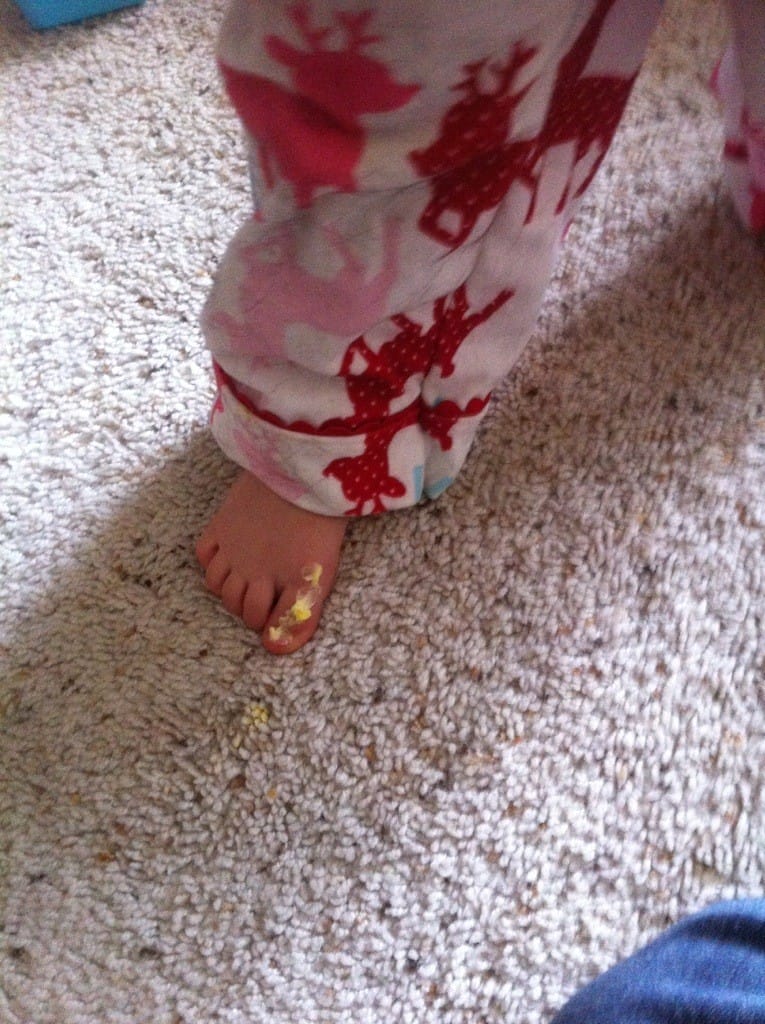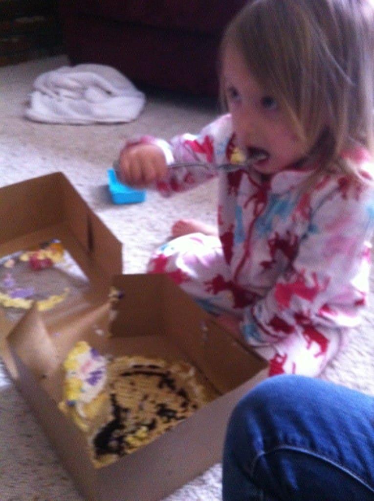 The downside to eating cake on the floor in your pajamas: frosting on your toes.