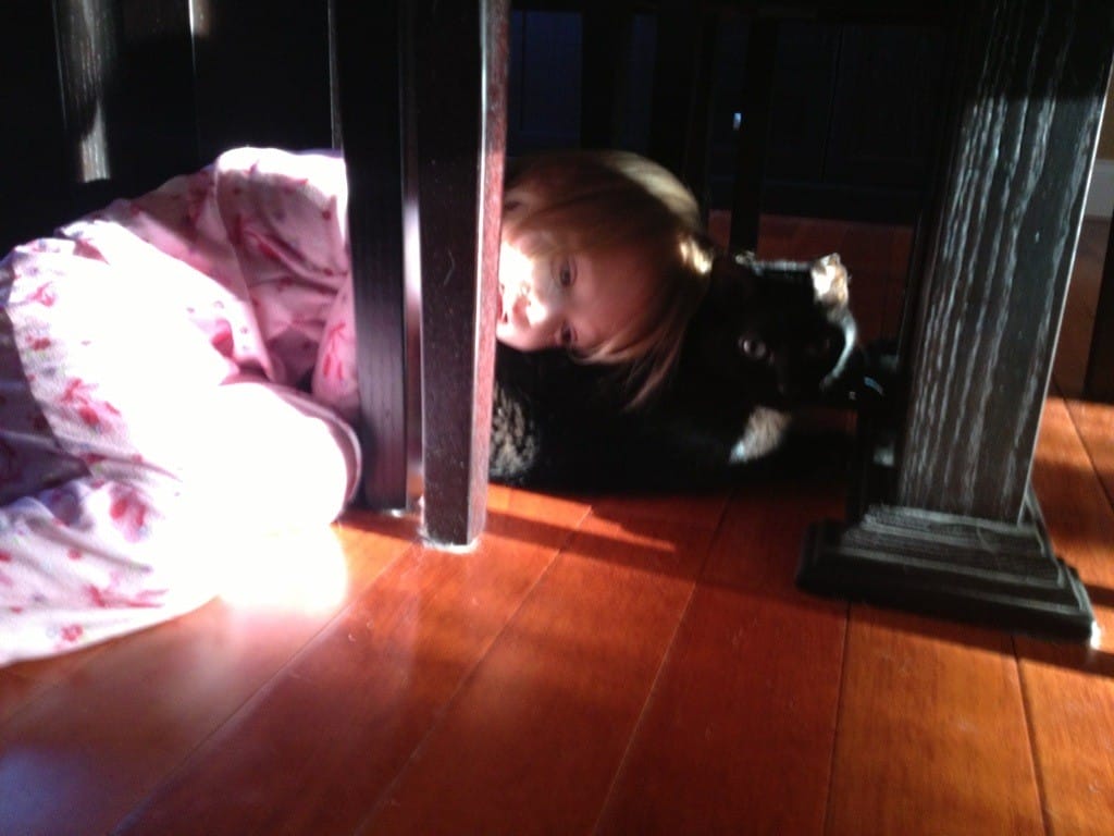 I find him where ever he hides. Here I am hugging him under the dining room table.