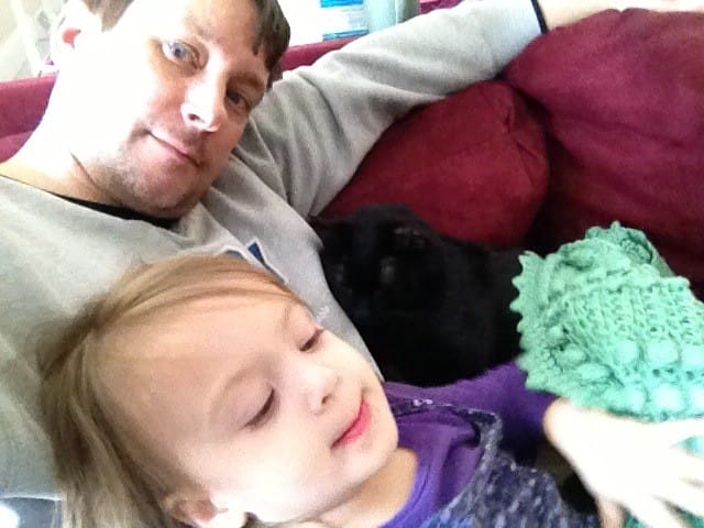 Dad is sick. So he’s getting a late start. Sammy and me are snuggling with him to make him feel better.