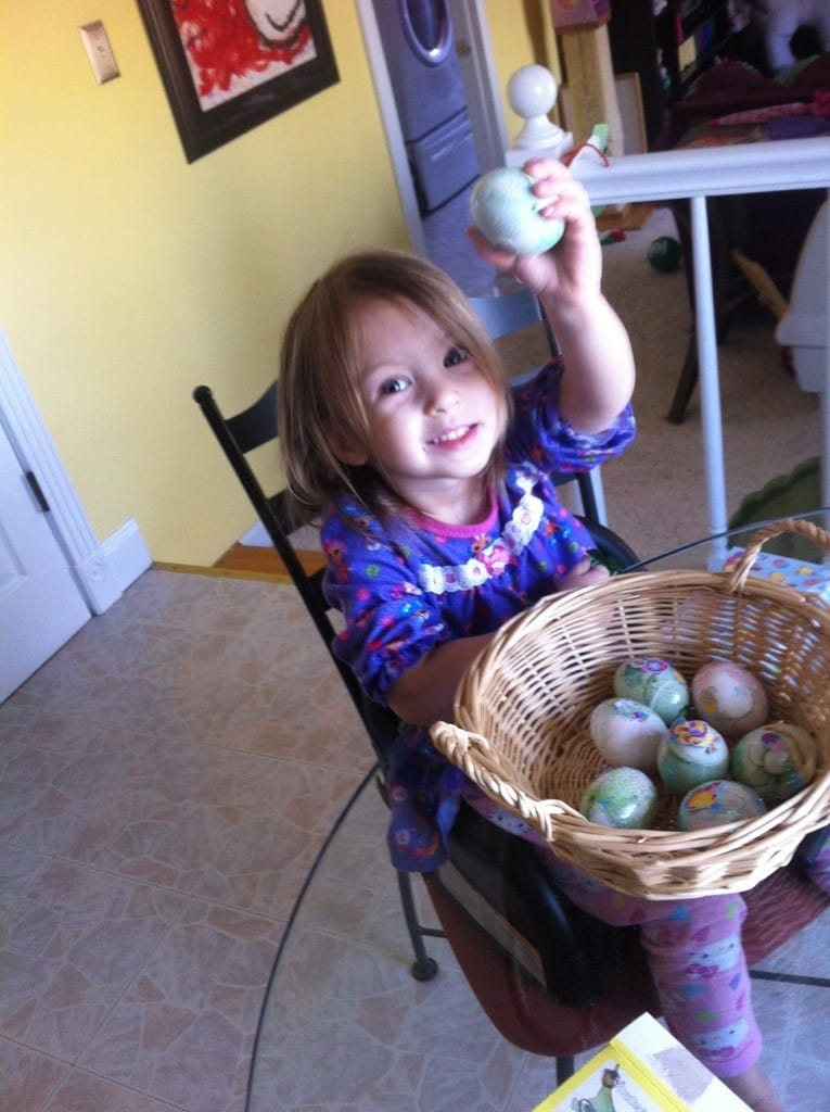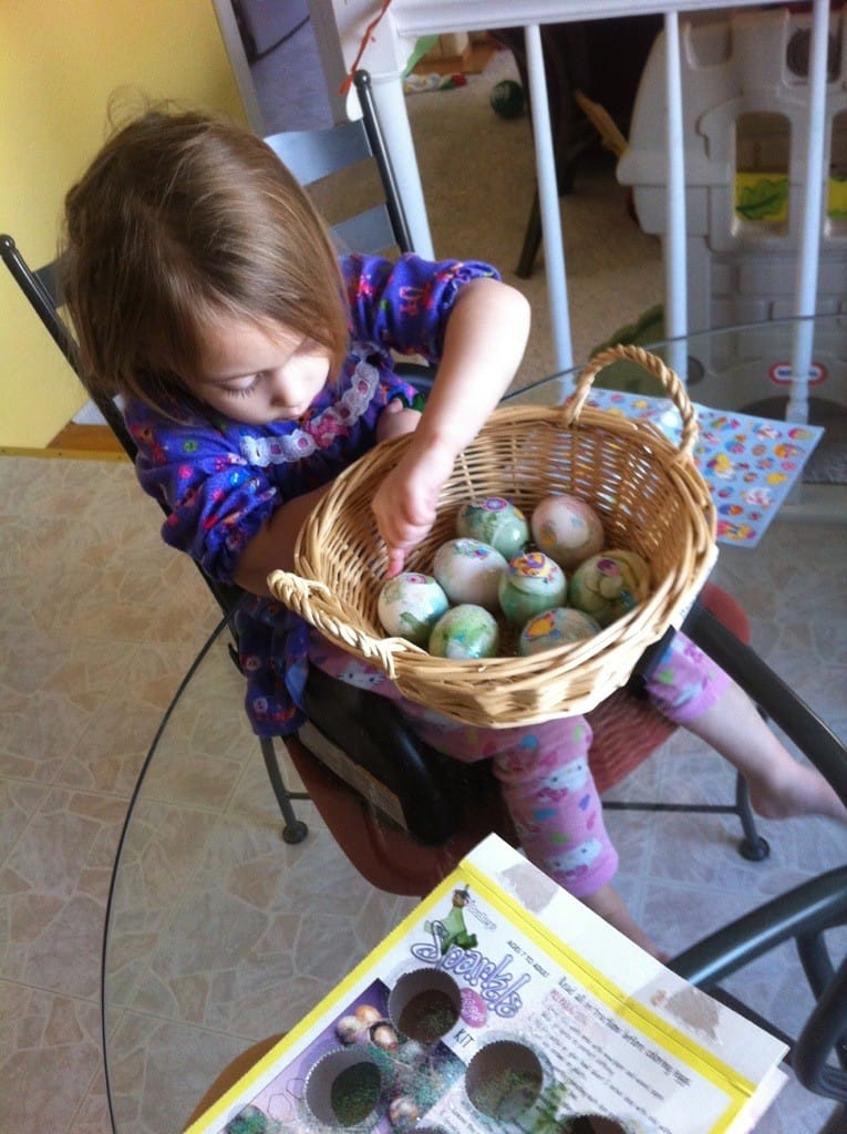 Mommy & I dyed eggs earlier this week, and put glitter on them. Today, I decorated them some more with Easter stickers. They’re beautiful!