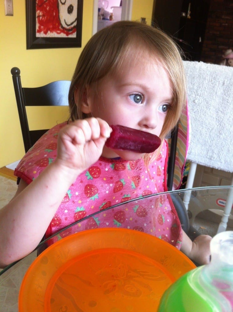 When we got home from the park, mommy & I were both hot & sweaty. Popsicles were a good idea – cherry for mommy & grape for me.