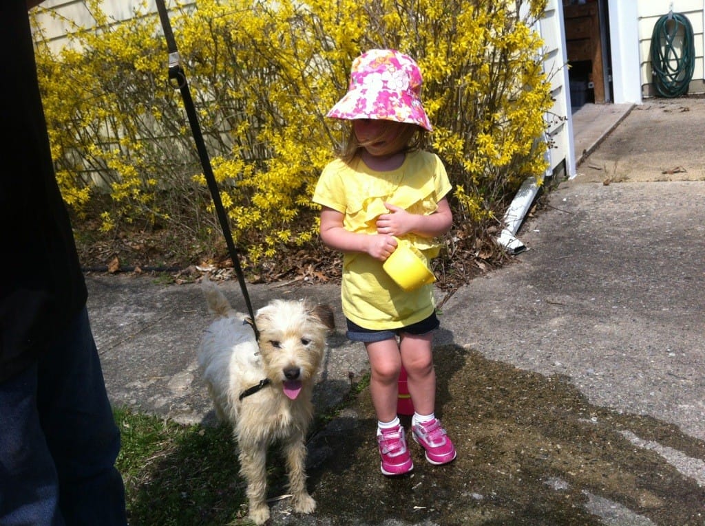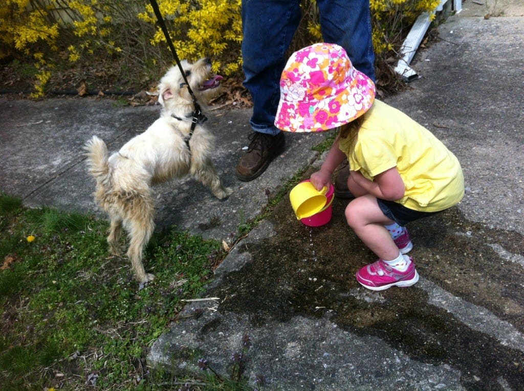Our neighbor, Greg, heard a dog crying down in the gulley behind our house. Mommy & I watched while he went down to rescue him, in case he had any trouble. Then mommy called his owners to come pick him up. I got him some water & helped look after him until his family came to pick him up. His name is Link.