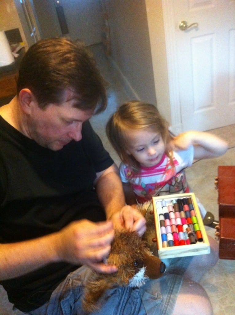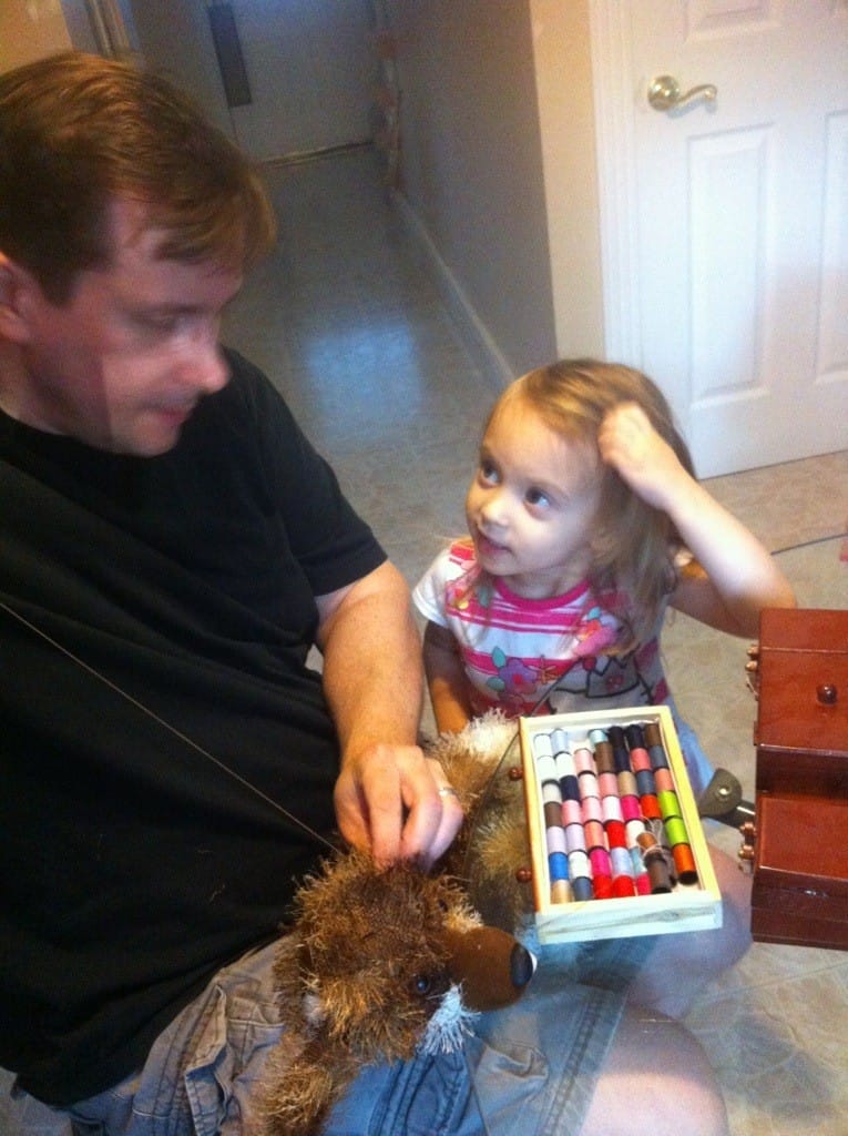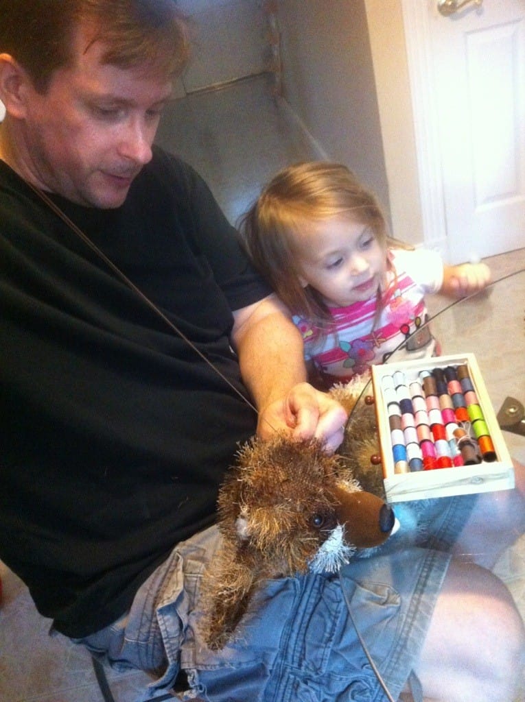 Poor Barry had a pokey thing coming out of his ear, so daddy had to perform surgery. Nurse Maddy assisted.