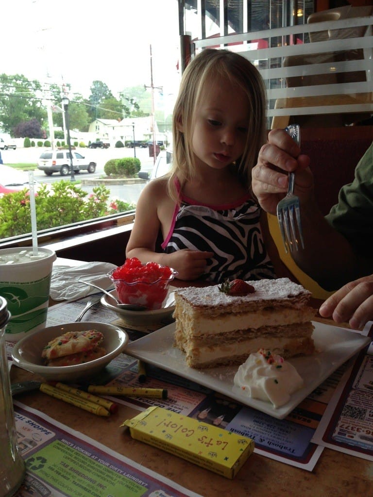 I had a long day of doctor’s appointments, and mommy & daddy said I could have a treat. I was gonna get frozen yogurt, but mommy & daddy were hungry. So we stopped at the Phily Diner. I got to order whatever I wanted… Got ice cream with cherries, cookies, and some pastry thing.