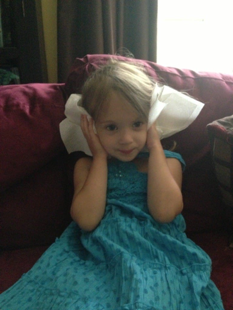 I don’t like getting my ear drops, but mommy & daddy say I have to. I hold paper towels over my ears for a while after I get them. It makes me feel better, but mom says I look silly.